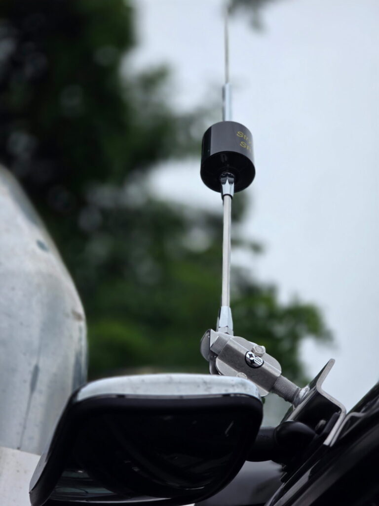 Solution: you know that mirror that is termed “over the door” on the passenger side, that is now your antenna mount.
